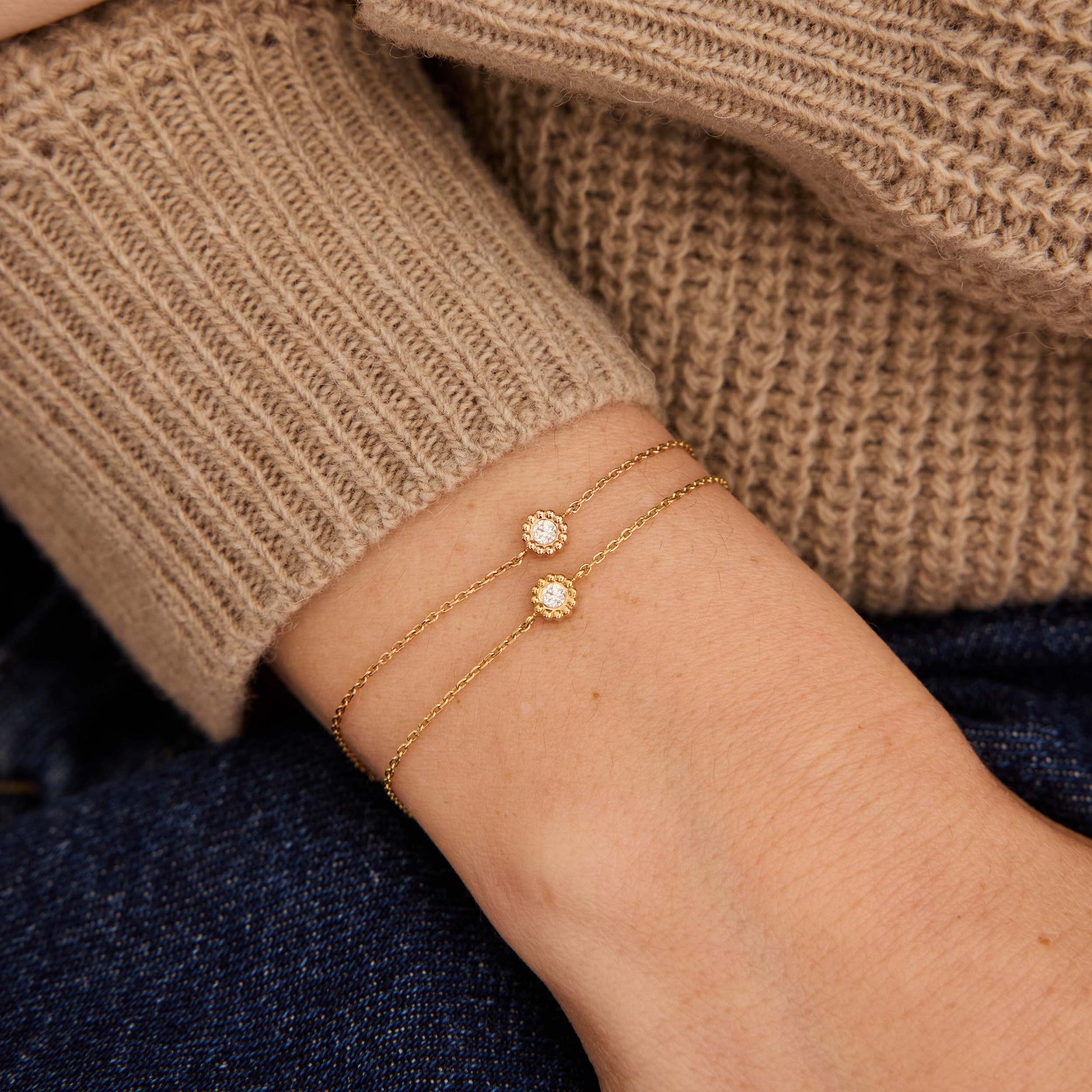 Le bracelet Marguerite est réglable, vous pouvez choisir de le fermer à 17 cm, 16 cm ou 15 cm. Ce bracelet est décliné en or jaune, rose et blanc 18 carats.