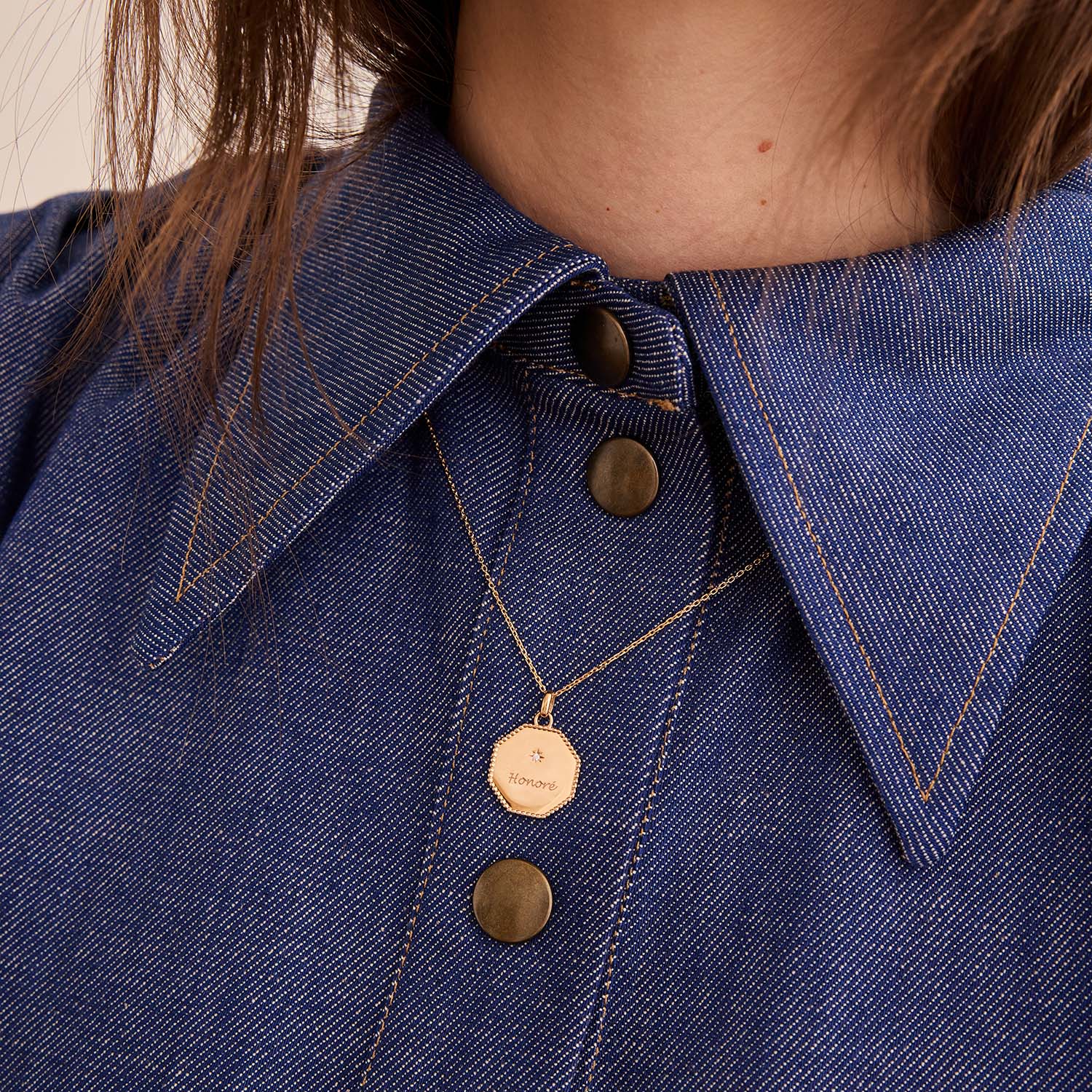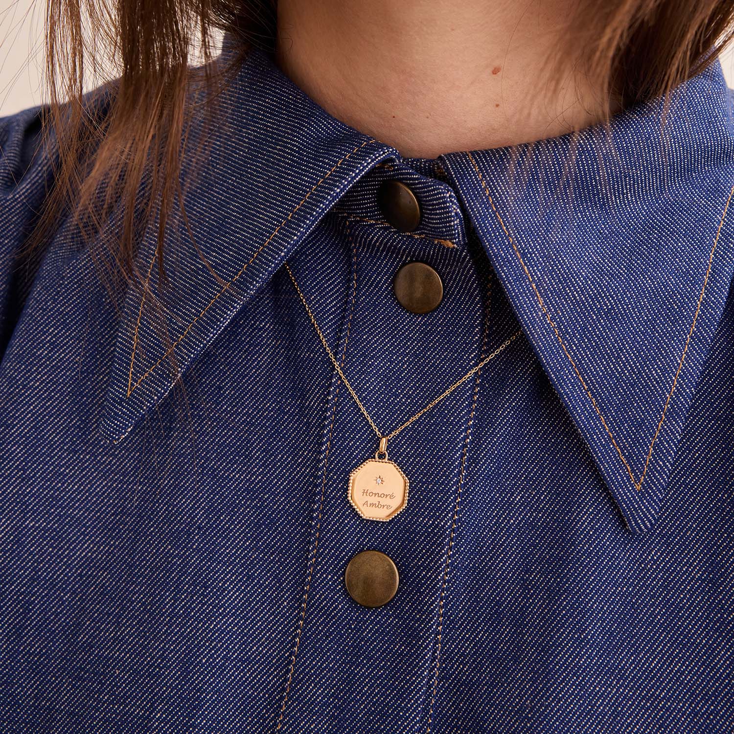 Une médaille riche d'une douce harmonie entre la pureté du diamant et la modernité de la forme octogonale, symbolique de la maison. Prénoms, dates, initiales ou même des mots doux, nos artisans joailliers graveront ce que vous souhaitez pour créer la médaille de vos rêves. Un bijou hautement symbolique qui fera partie de vous.