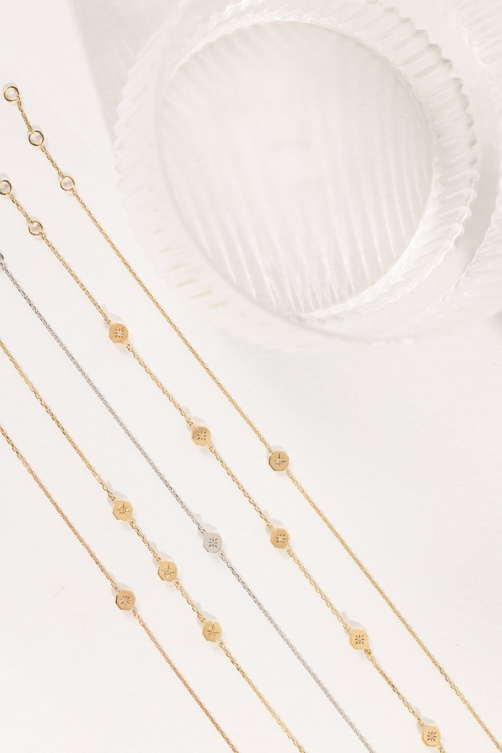 Faisant également parti de la collection, le bracelet Pampilles Mini Éternité ne passe pas inaperçu avec ses médailles octogonales. Ce bracelet personnalisable et serti de diamants est évolutif, il est possible d’ajouter des médailles par la suite.