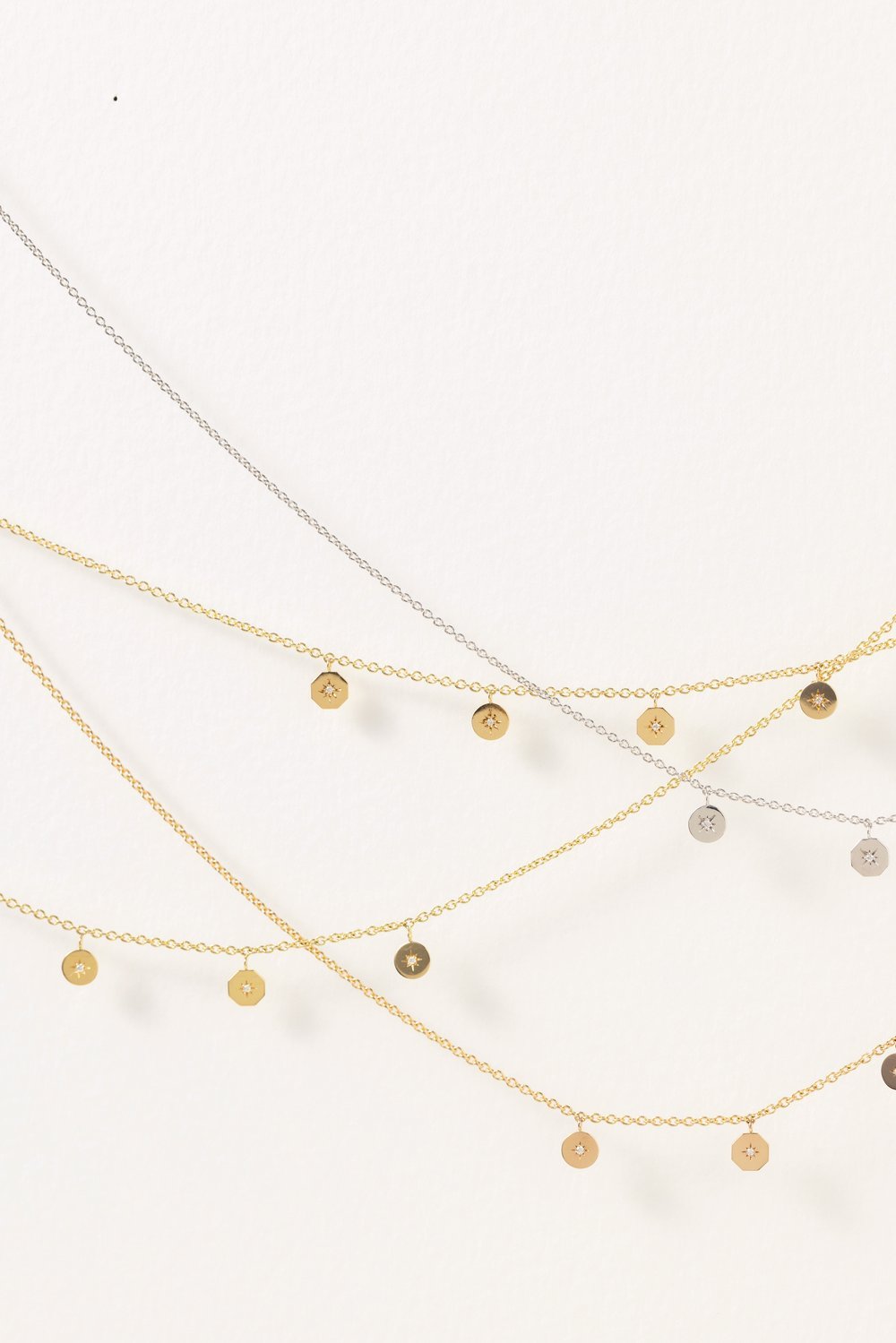 Le collier pampilles Mini Éternité combine trois médailles Mini Éternité pour un résultat légèrement plus imposant. Les colliers se déclinent dans les trois couleurs d’or et sont personnalisables.