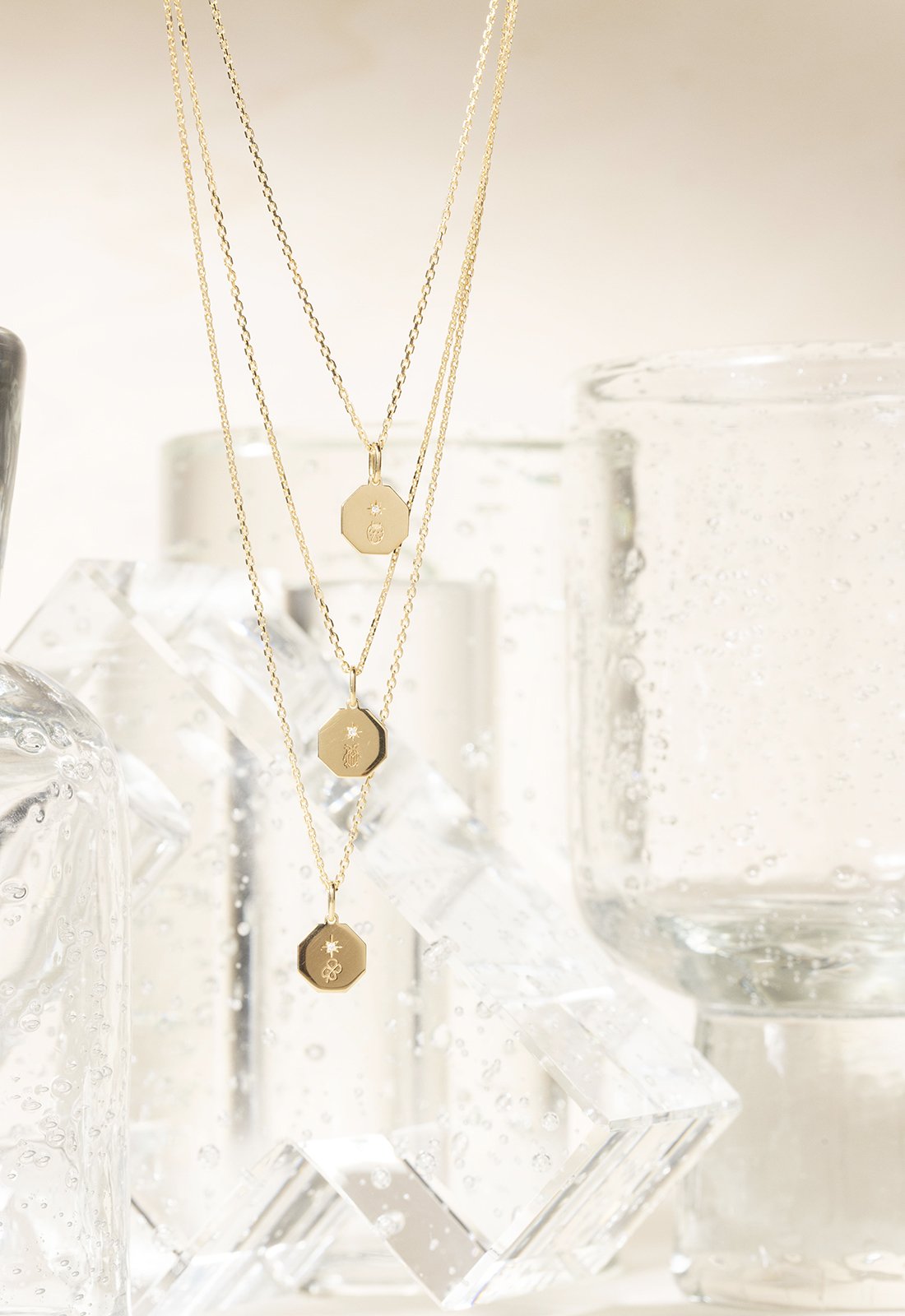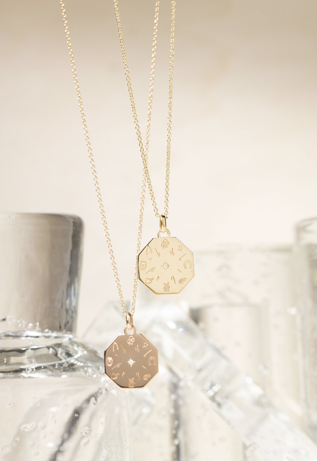 Pour cette collection, la créatrice a voulu créer des colliers amulettes originaux. Elle a souhaité graver des symboles de la chance sur ces pendentifs, symboles qui nous donnent de la force et du courage et qui nous poussent à réaliser nos rêves. Ces gravures sont des symboles pensés et dessinés à la main par la créatrice.