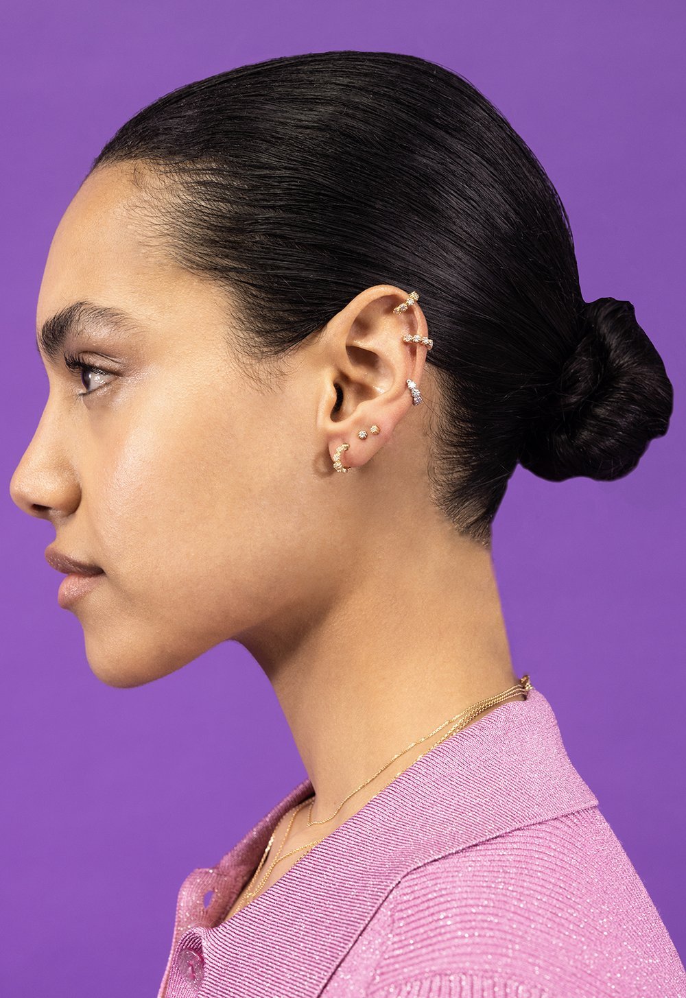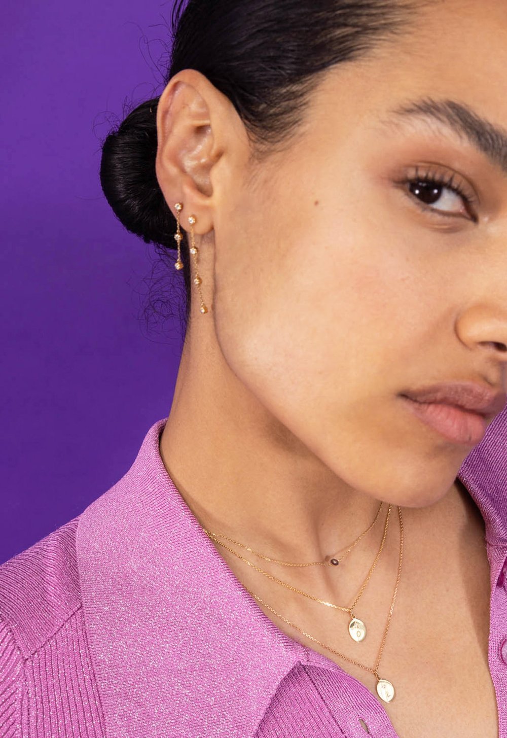 On adore associer les longueurs différentes avec une boucle d’oreille pendante trois motifs, une boucle d’oreille pendante quatre motifs et une earcuff par exemple.