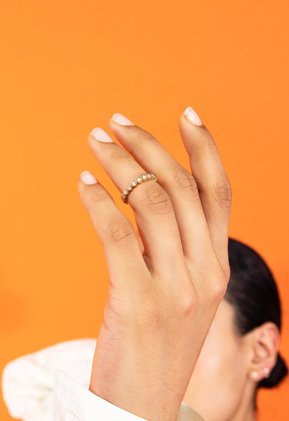 Il est possible d’assortir l’alliance Mini Marguerite à la bague Marguerite, les diamants se reflèteront les uns les autres et viendront mettre en valeur les pièces joaillières.