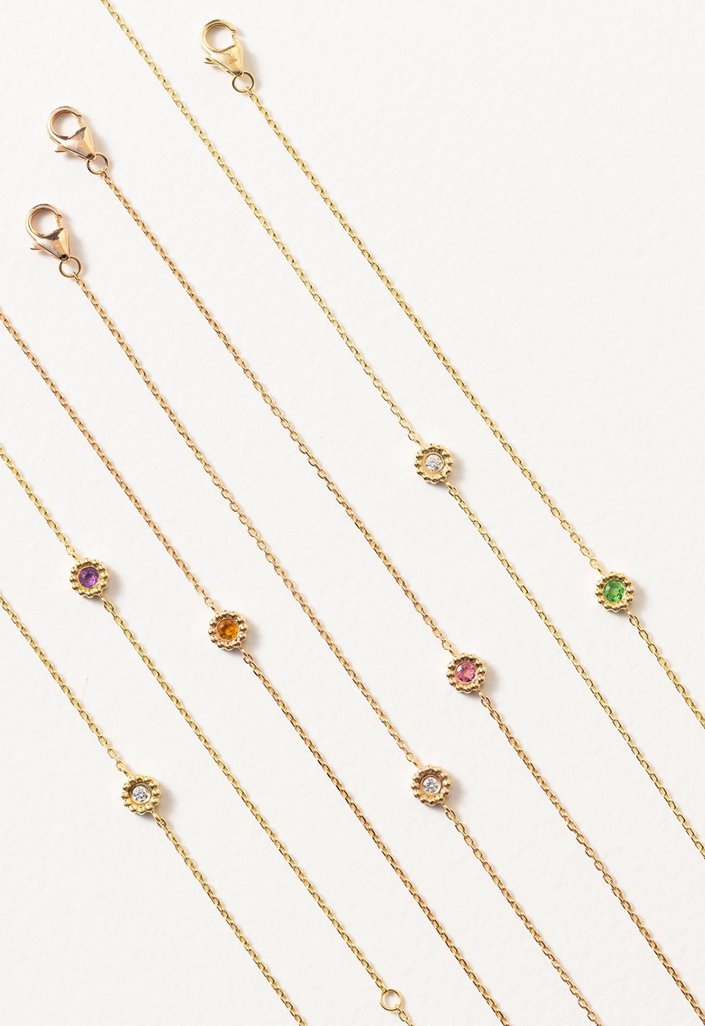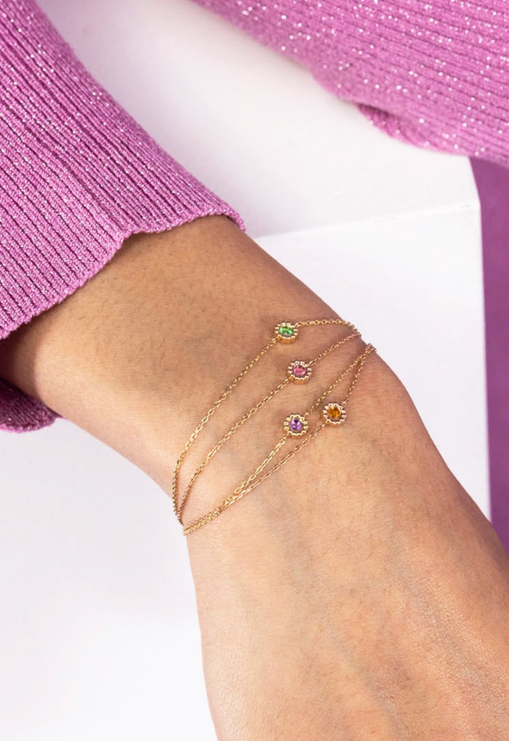 Osez la couleur avec les bracelets Marguerite sertis de pierres précieuses. Laquelle choisirez-vous? La tsavorite verte, l’améthyste violette, le saphir rose ou le saphir orange ? Le choix est vaste !