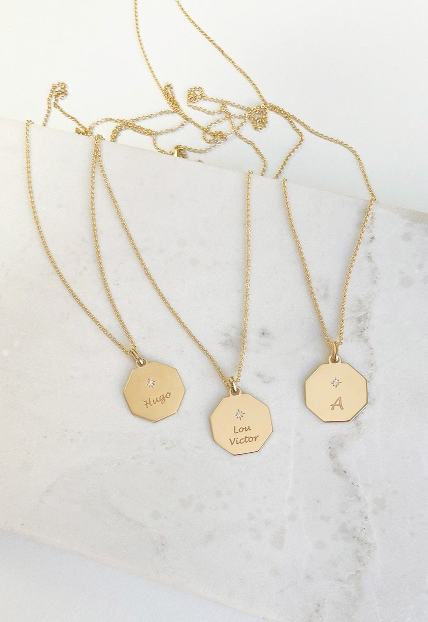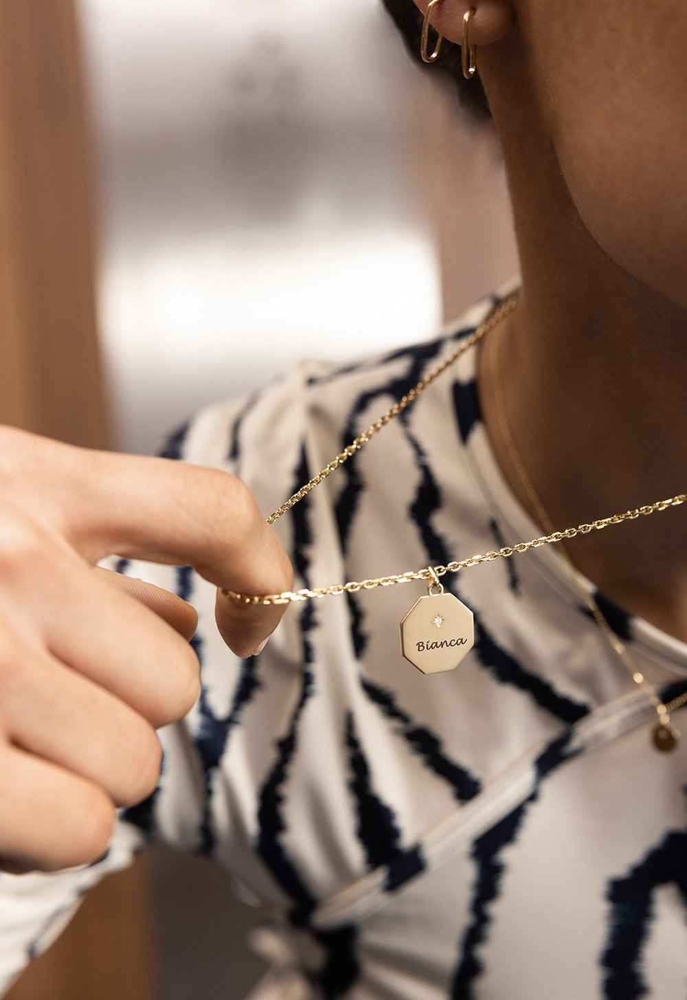 La créatrice a souhaité apporter de la modernité aux emblématiques médailles en or de joailliers : la forme octogonale est née. Plus contemporaine, la médaille octogonale apporte le brin d’originalité que l’on cherche aujourd’hui dans les bijoux personnalisés en or.