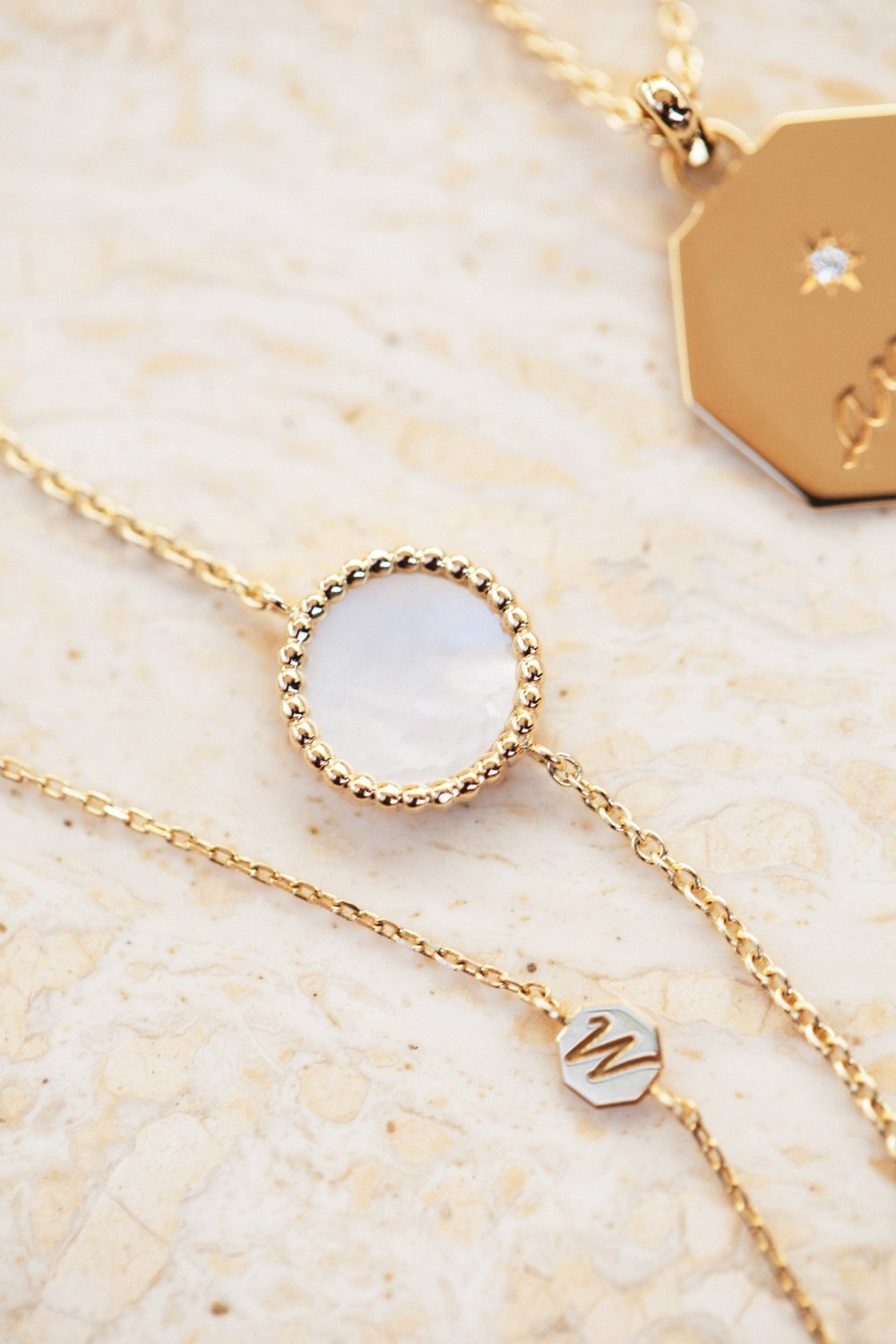 La nacre est une pierre fine que l’on trouve dans les océans. Elle est particulière car il s’agit de la seule pierre organique, vivante, de la collection Nuances, ce qui explique l’attention dont elle nécessite pour ne pas s’abîmer.