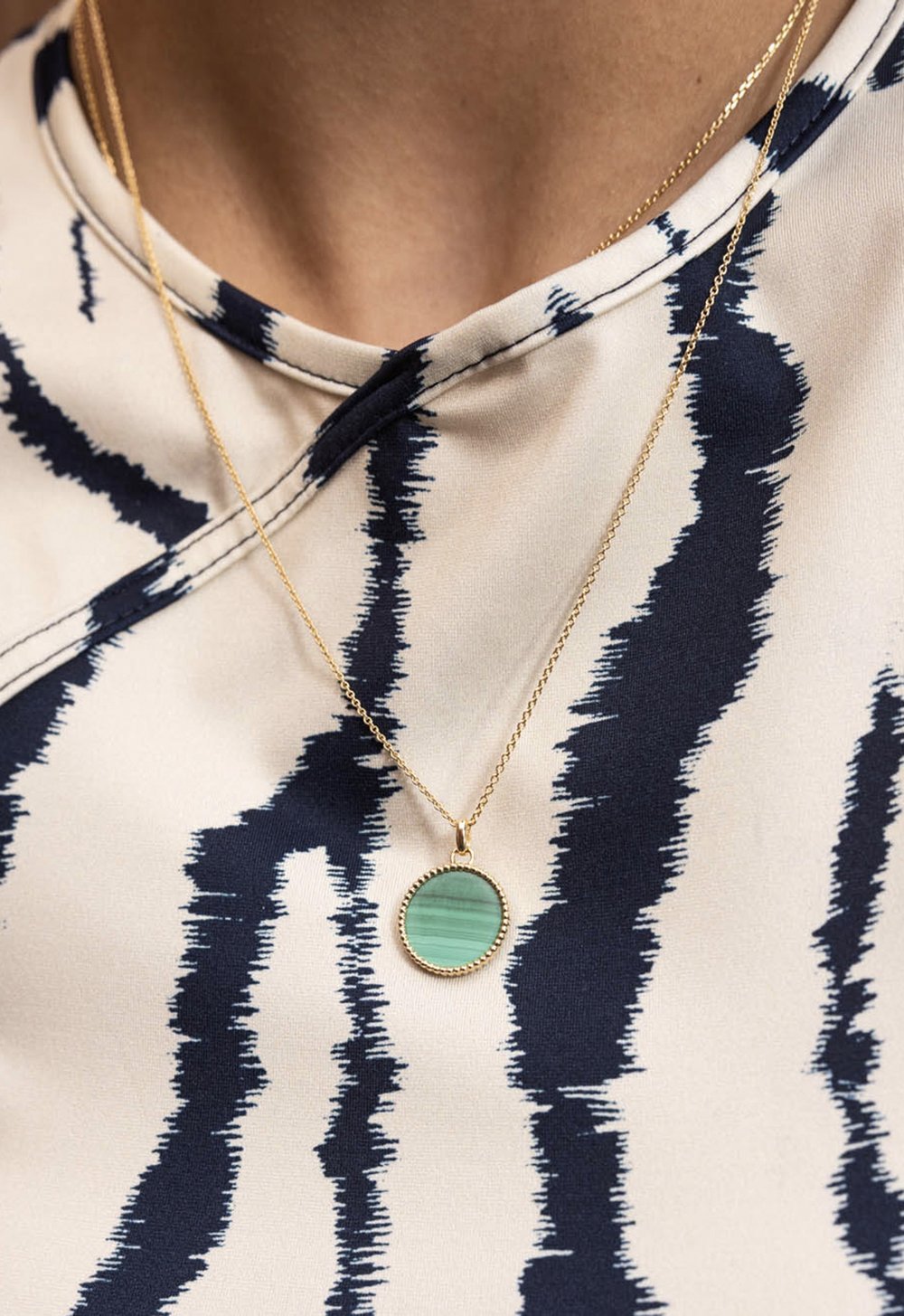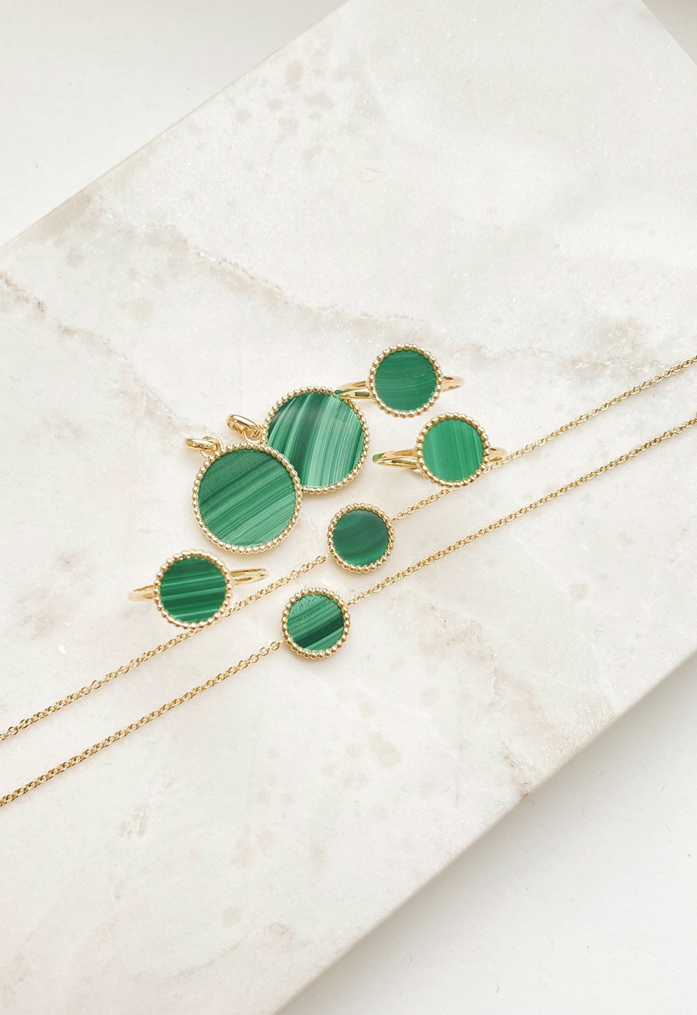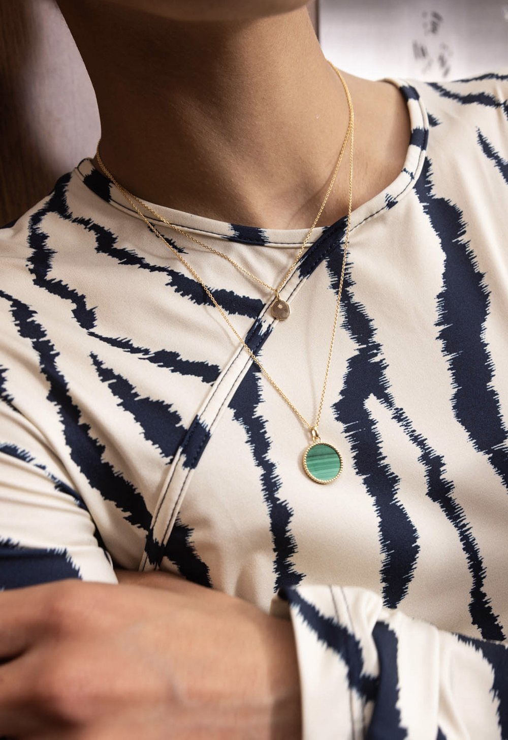 Lapis lazuli, malachite, nacre, onyx, opale rose, cornaline et turquoise : nombreuses et variées sont les pierres fines qui ornent les bijoux de cette collection haute en couleurs. Chacune de ces pierres fines a été méticuleusement choisie pour sa couleur unique, son aspect, ses bienfaits indéniables et son histoire.
