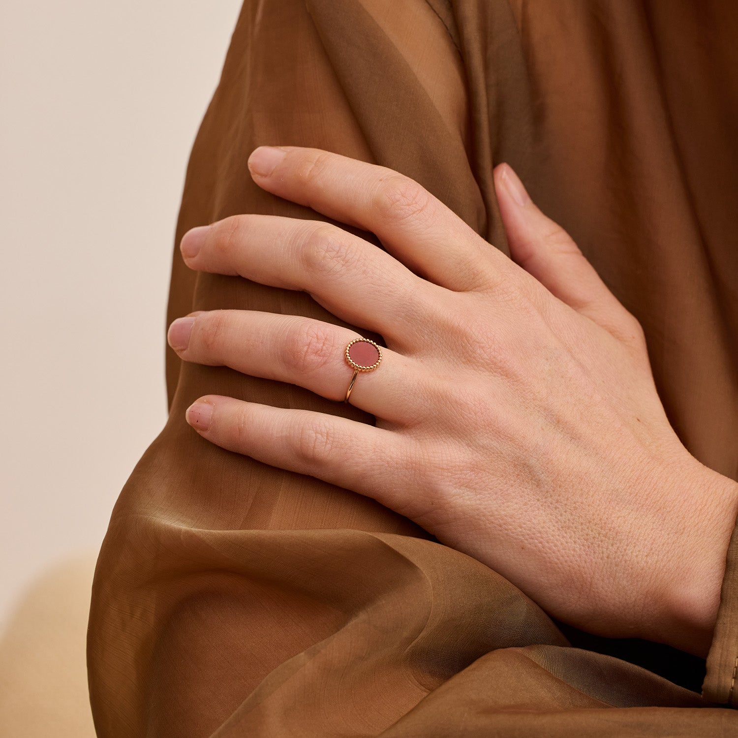 La cornaline associée aux perles d'or rose amène un aspect chaleureux à cette bague Nuances. La singularité des pierres fines fait que chaque bague de la collection est unique. La cornaline n’est pas opaque, elle est légèrement transparente, sa couleur va donc varier selon votre couleur de peau.
