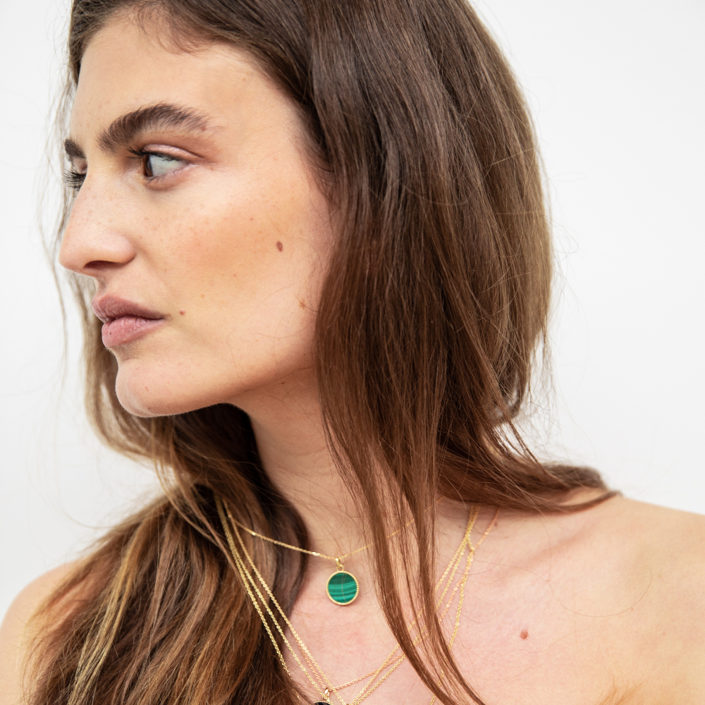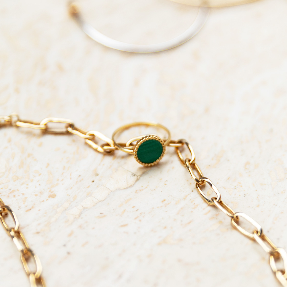 On adore les bijoux ornés de malachite, car c'est une pierre singulière qui se porte bien plus facilement que l'on pense. Un bijou osé mais intemporel.