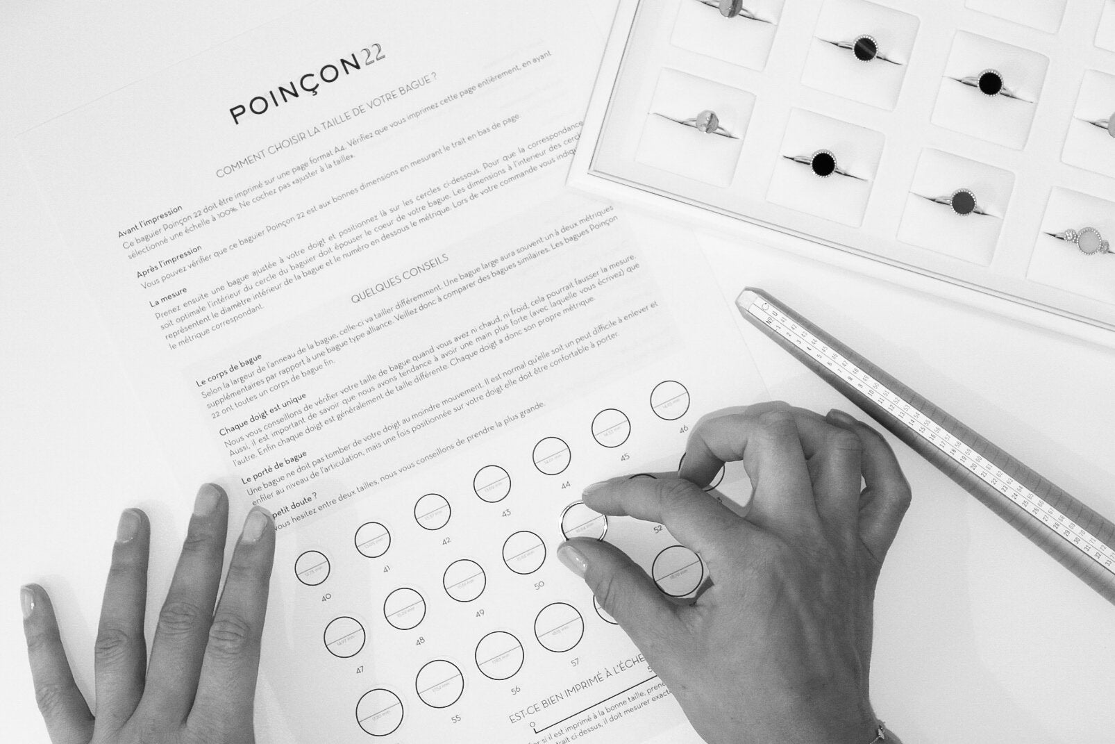 Nous allons vous guider dans votre choix avec le baguier Poinçon 22 que vous pouvez télécharger ci-dessous. Suivez les instructions d’impression et nos conseils afin de définir le bon métrique de la bague que vous souhaitez.