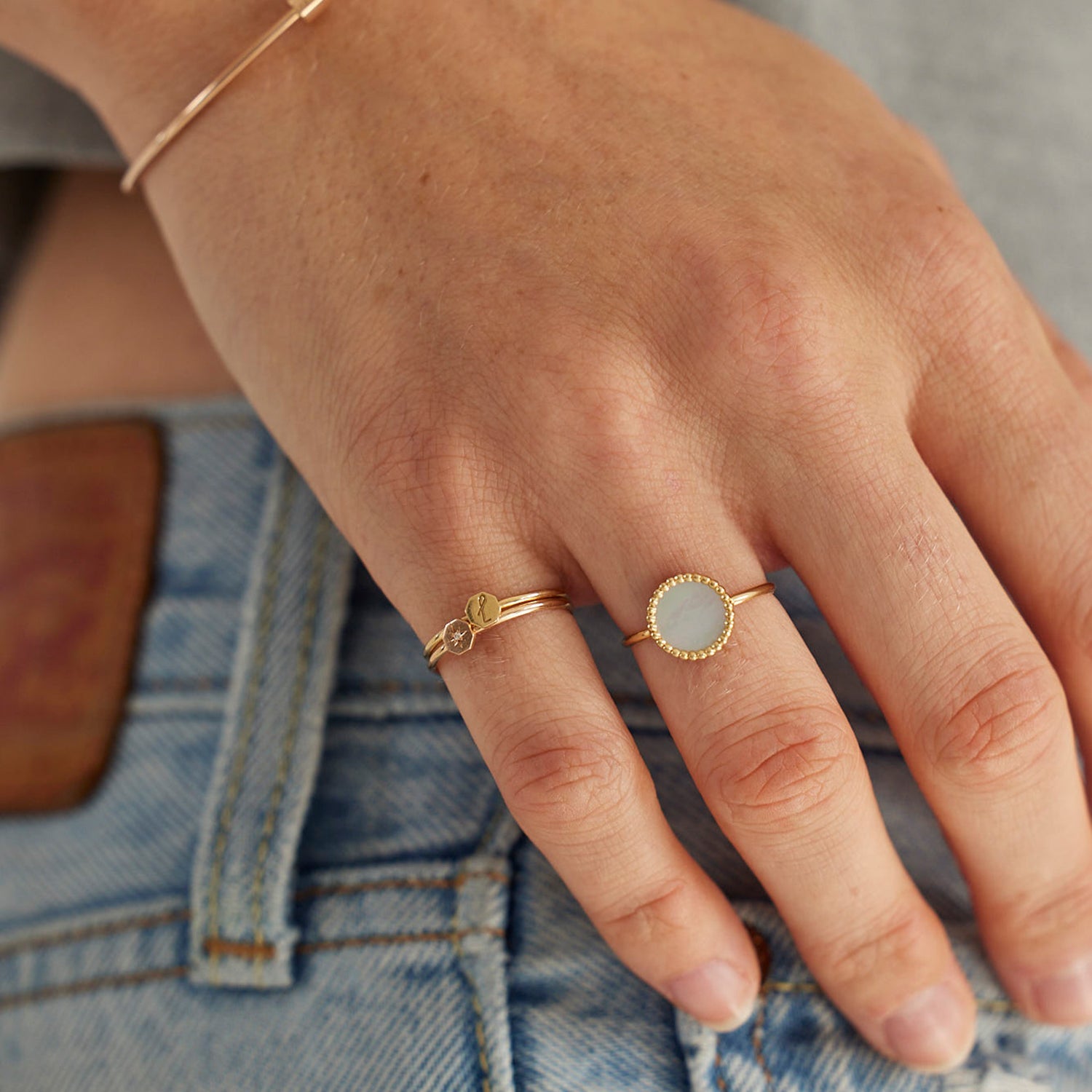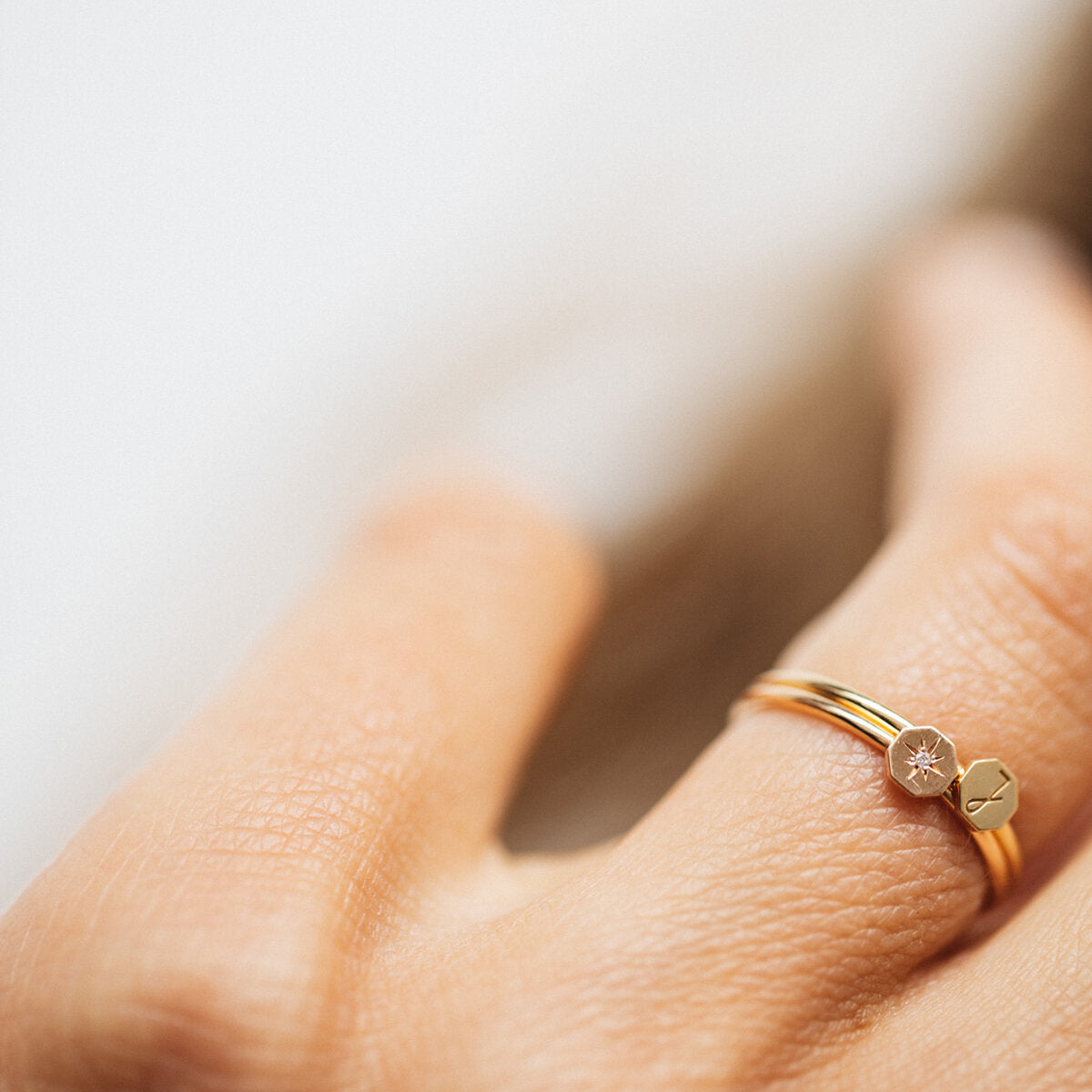 “L’idée d’accumuler les bagues fines des collections Initiale et Éternité est merveilleuse. À travers ces créations, je voulais que vous puissiez jouer avec vos bagues, les associer, les dépareiller et les personnaliser.” - Jessica, créatrice de Poinçon 22
