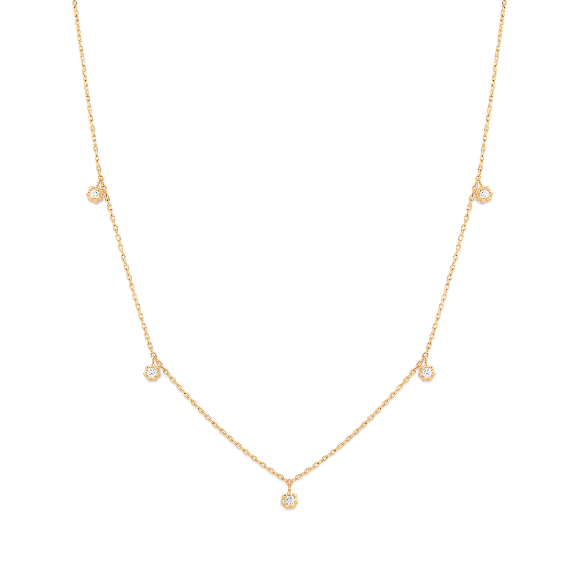 peau. Réalisé en or 18 carats recyclé, le collier se décline en or jaune, or rose ou or blanc. Sa chaîne forçat limée est ponctuée de cinq motifs Mini Marguerite sertis de diamants naturels FG VS, qui captent la lumière avec subtilité. Chaque fleur révèle un éclat discret, comme une lumière suspendue sur la peau. Au dos des motifs, la personnalisation est possible avec une initiale ou un chiffre, pour en faire un bijou unique, pensé pour accompagner chaque instant. Le collier Mini Marguerite se porte seul pour une touche lumineuse et raffinée, ou en accumulation avec d’autres créations Poinçon 22 pour une allure encore plus personnelle.